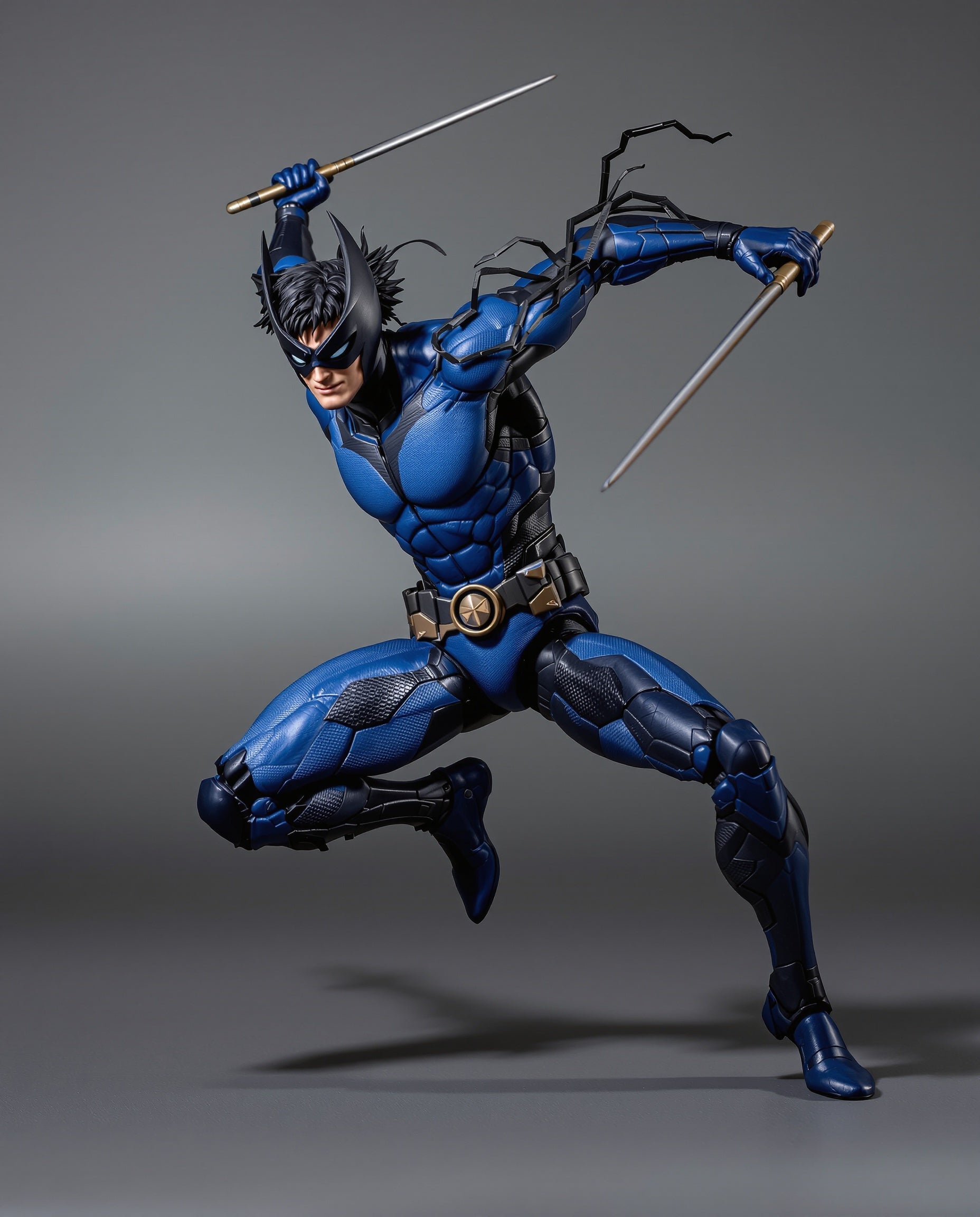 Acrobatic Nightwing figure with escrima sticks and detailed blue suit. Features multiple action poses and accessories.