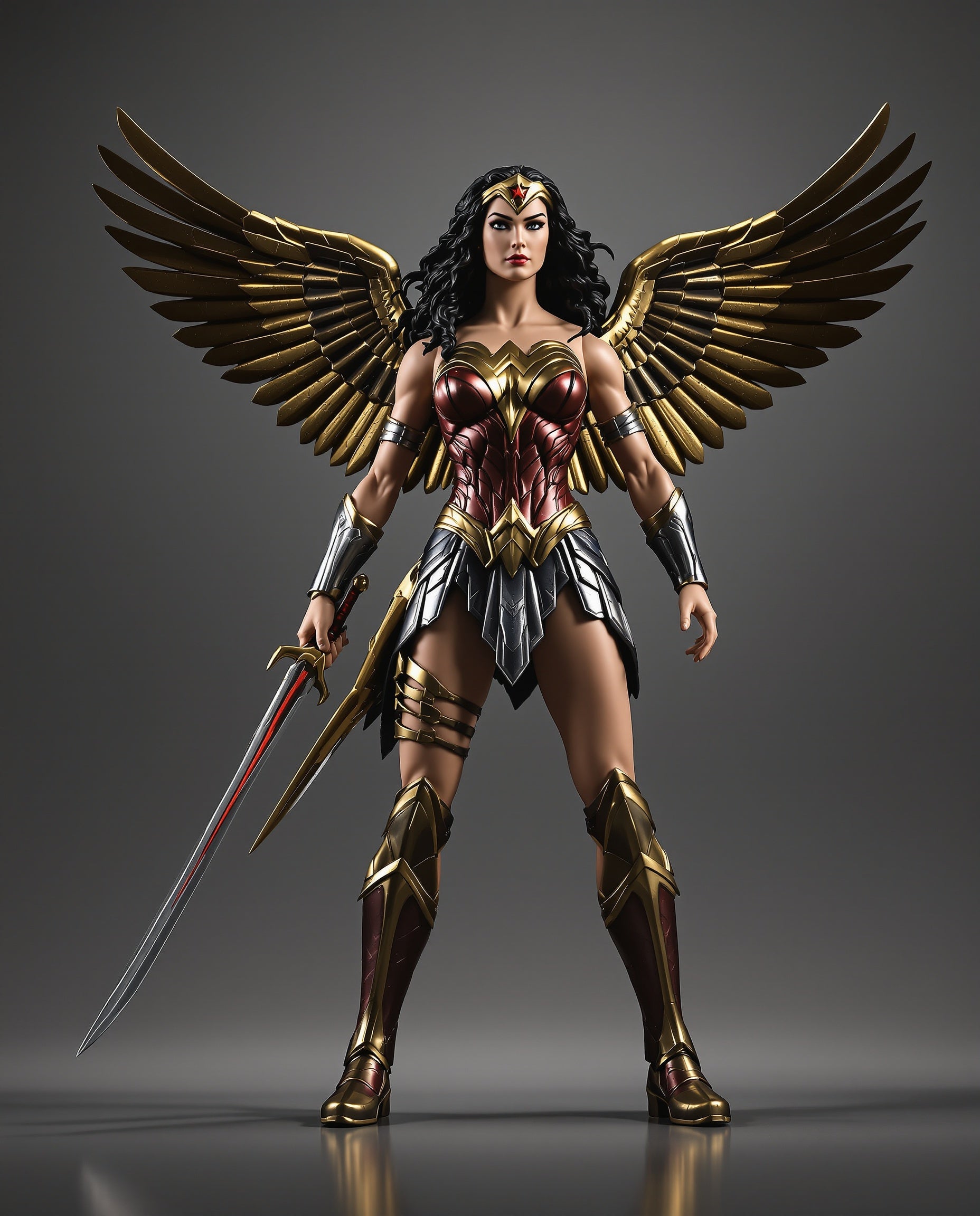 Gal Gadot Wonder Woman in golden eagle armor from WW84. Features intricate golden armor details, Lasso of Truth with wire, and warrior accessories. Includes alternate tiara and multiple expressive head sculpts.